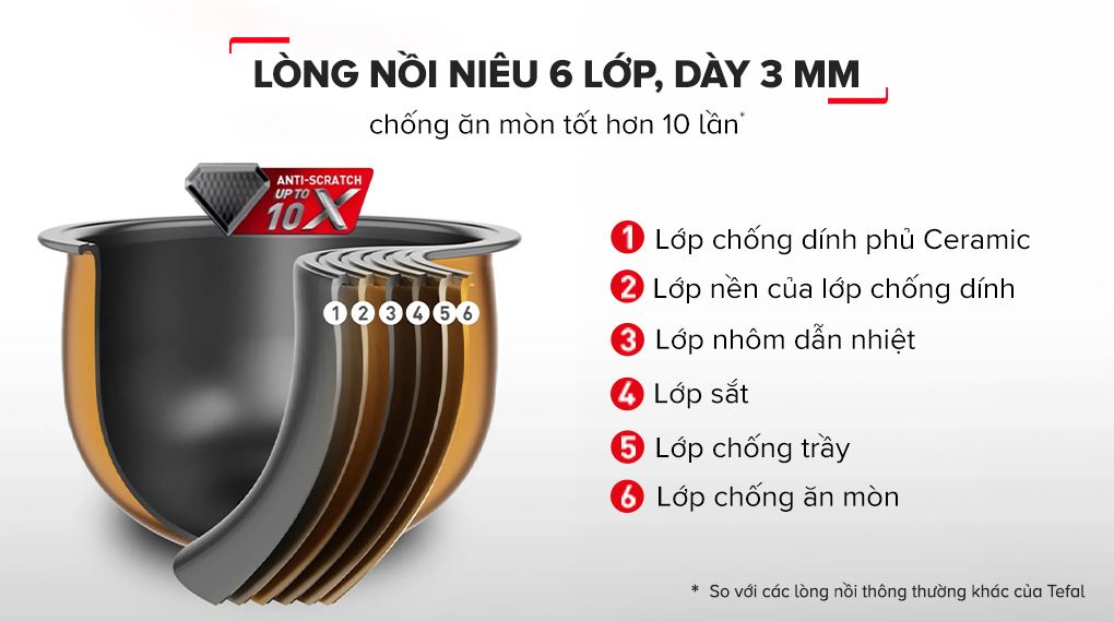 Tefal RK819868 trang bị lòng nồi dạng niêu độc quyền, dày 3mm với 6 lớp cấu tạo: lớp chống ăn mòn, lớp chống trầy, lớp sắt, lớp nhôm dẫn nhiệt, nền chống dính và lớp chống dính phủ Ceramic. Thiết kế này giúp tăng bề mặt gia nhiệt hơn 10%, nâng cao hiệu quả truyền và khuếch tán nhiệt, giúp hạt cơm chín đều, dẻo thơm và hạn chế dính cháy để dễ dàng vệ sinh sau mỗi lần sử dụng.