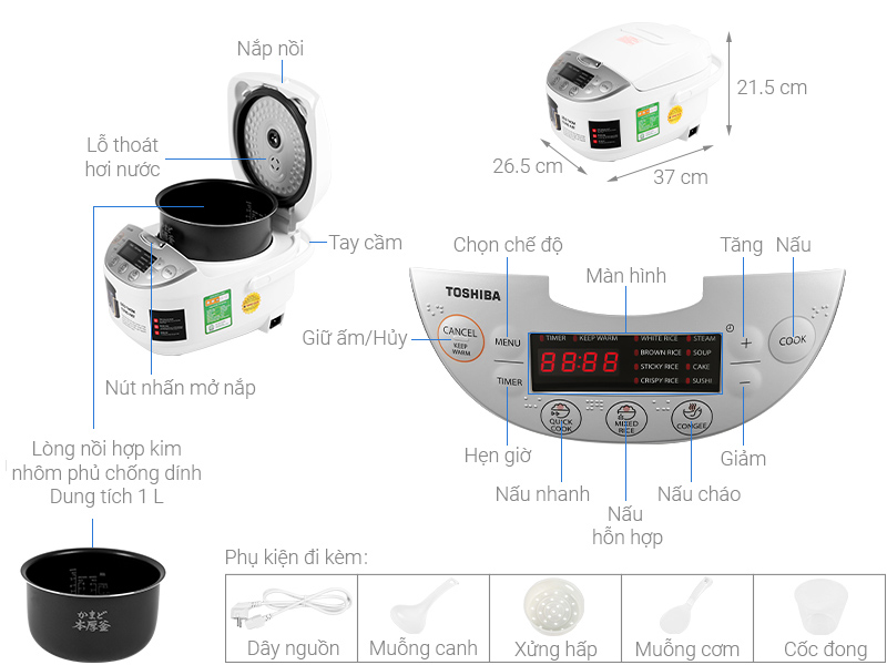 Đi kèm với nồi cơm điện tử Toshiba này có xửng hấp, giúp bạn dễ dàng chế biến các món hấp đơn giản như xôi, bánh bao và các loại bánh khác.