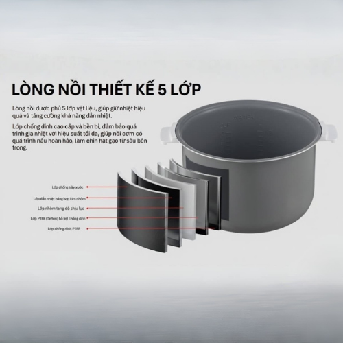 Lòng nồi được làm từ hợp kim nhôm giúp truyền nhiệt nhanh và đều. Điều này giúp cơm chín đồng đều hơn.
