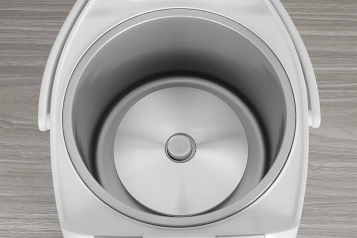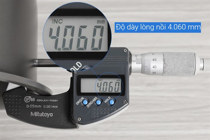 Lòng nồi làm từ hợp kim nhôm dày 4.060 mm, phủ lớp chống dính cao cấp PTFE và Fluorocarbon Polymers, đảm bảo bền bỉ, dễ vệ sinh và an toàn cho sức khỏe. Thiết kế đáy nồi dạng tròn bầu giúp truyền nhiệt đều hơn, từ đó cơm chín mềm, ngon và không bị dính đáy.