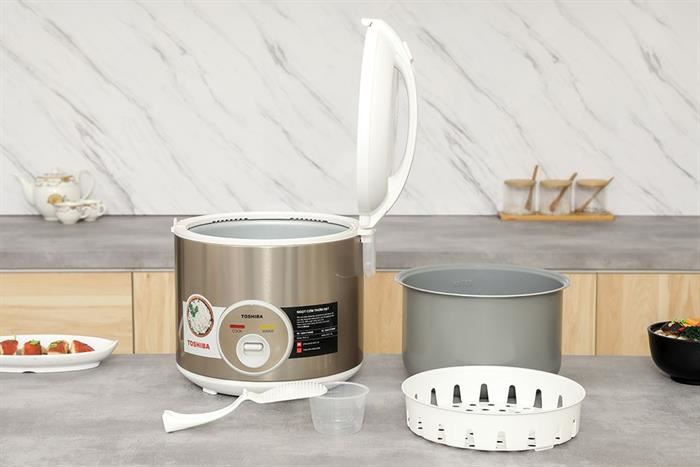 Ngoài ra, nồi cơm điện Toshiba RC-18JH1TVN(N) còn đi kèm xửng hấp tiện dụng, giúp người dùng linh hoạt hơn trong việc chế biến món ăn như hấp rau, trứng hay bánh. Phụ kiện kèm theo gồm vá múc cơm và cốc đong gạo. Dây điện tháo rời tiện lợi khi bảo quản hoặc mang đi.