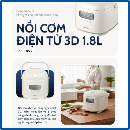 Nồi cơm điện tử 3D 1.8L Paveden PR-3D18BE đáp ứng tốt nhu cầu nấu cơm của gia đình Việt nhờ công nghệ gia nhiệt 3D, dung tích lớn, lòng nồi chống dính và nhiều chế độ nấu tiện lợi. Với thiết kế dễ dùng, độ bền ổn định và khả năng nấu cơm ngon đều, sản phẩm là lựa chọn đáng cân nhắc trong phân khúc nồi cơm điện tử hiện nay.