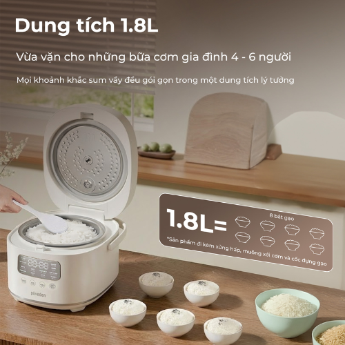 Dung tích 1.8 lít cho phép nấu lượng cơm đủ cho 4–6 người ăn trong một lần. Đây là dung tích phổ biến, phù hợp với đa số gia đình Việt hiện nay.