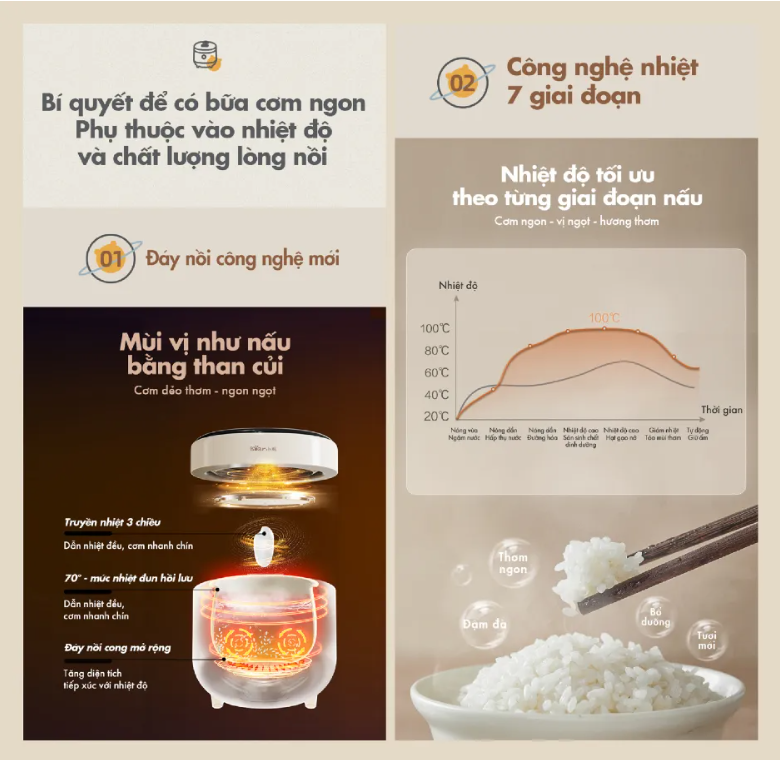 Thiết kế lòng nồi thông minh. Lòng nồi bầu, thành nồi dày. Nhiệt độ phủ đều. Thơm như cơm nấu bằng than củi, hạt cơm tơi xốp, dẻo mềm.