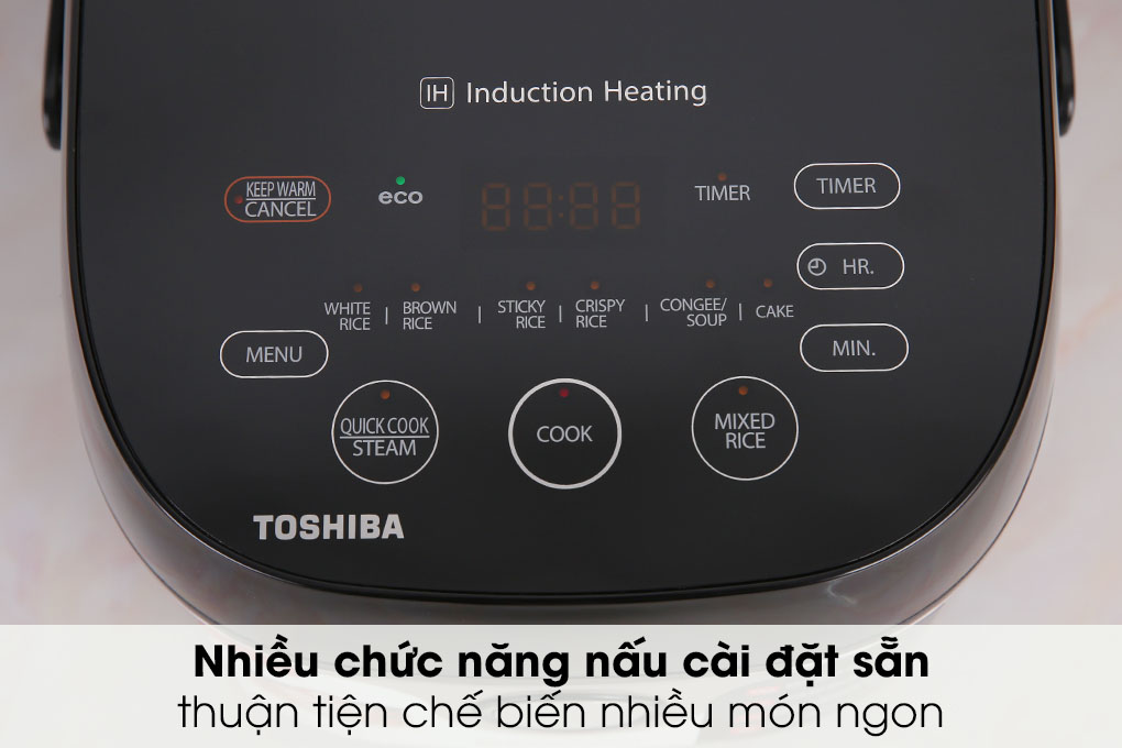 Nồi cơm điện tử cao tần Toshiba RC-10IX1PV tích hợp nhiều chức năng nấu tiện lợi như: nấu cơm (cook), nấu cơm trắng (white rice), nấu gạo nếp (sticky rice), nấu nhanh/hấp (quick/steam), nấu cơm cháy (crispy rice), nấu gạo lứt (brown rice), nấu cháo/súp (congee/soup), làm bánh (cake), nấu cơm trộn (mixed rice), giữ ấm (keep warm).