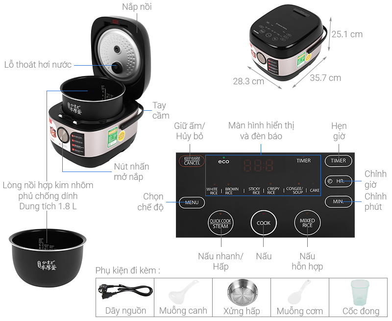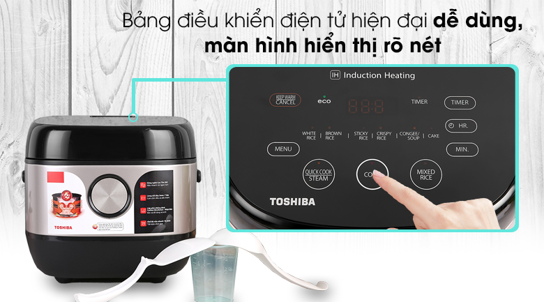 Nồi được trang bị bảng điều khiển cảm ứng hiện đại với màn hình hiển thị rõ ràng, ngôn ngữ tiếng Anh trực quan. Với nhiều chức năng nấu đa dạng như: nấu thông thường (cook), nấu gạo trắng thường (white rice), nấu cơm cháy (crispy rice), nấu gạo trộn (mixed rice), nấu gạo nếp (xôi) (sticky rice), nấu nhanh/hấp (quick cook/steam), nấu gạo lứt (brown rice), cháo/súp (congee/soup), làm bánh (cake), giữ ấm (keep warm), bạn có thể dễ dàng chế biến nhiều món ăn khác nhau chỉ với một chiếc nồi.