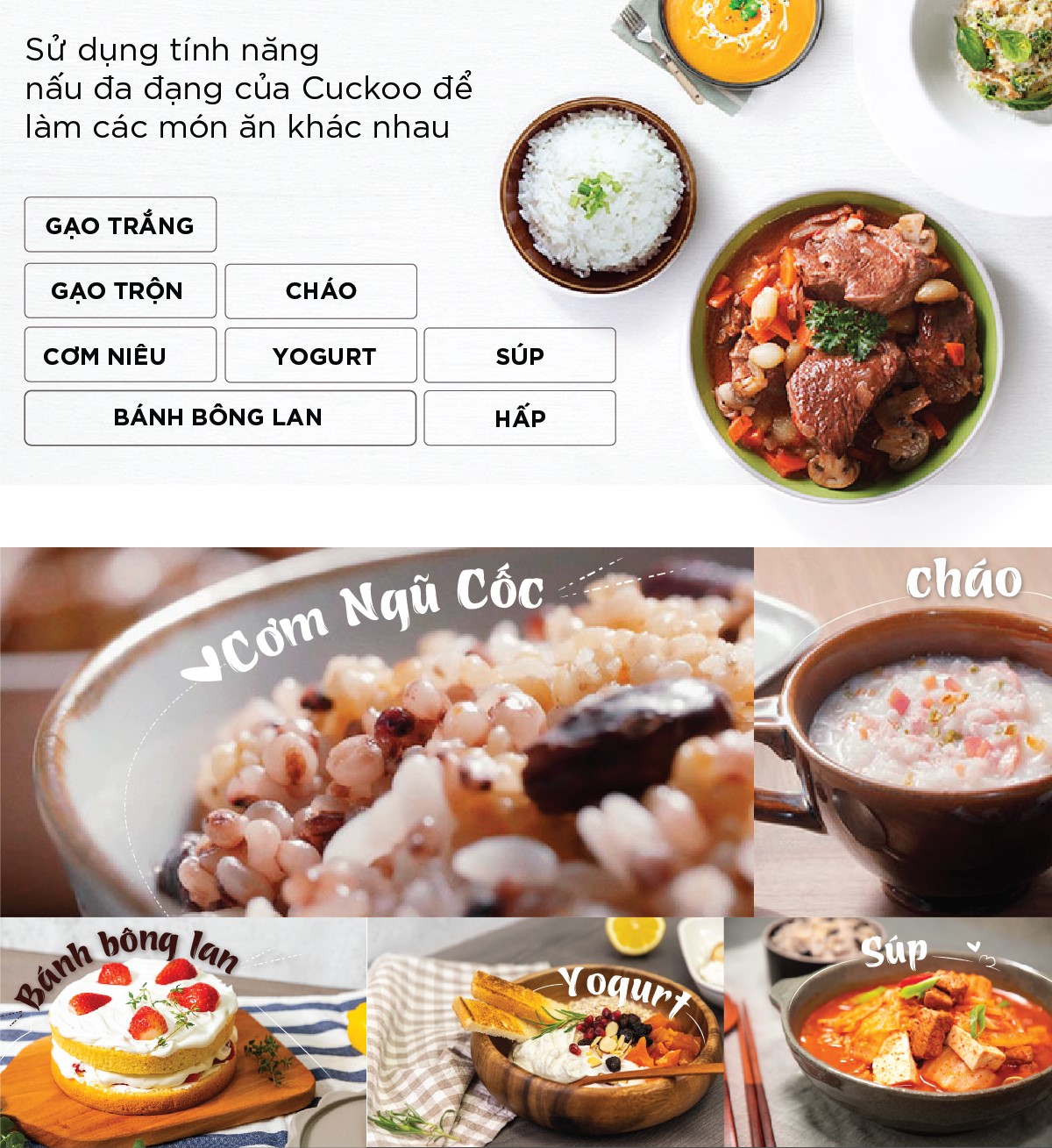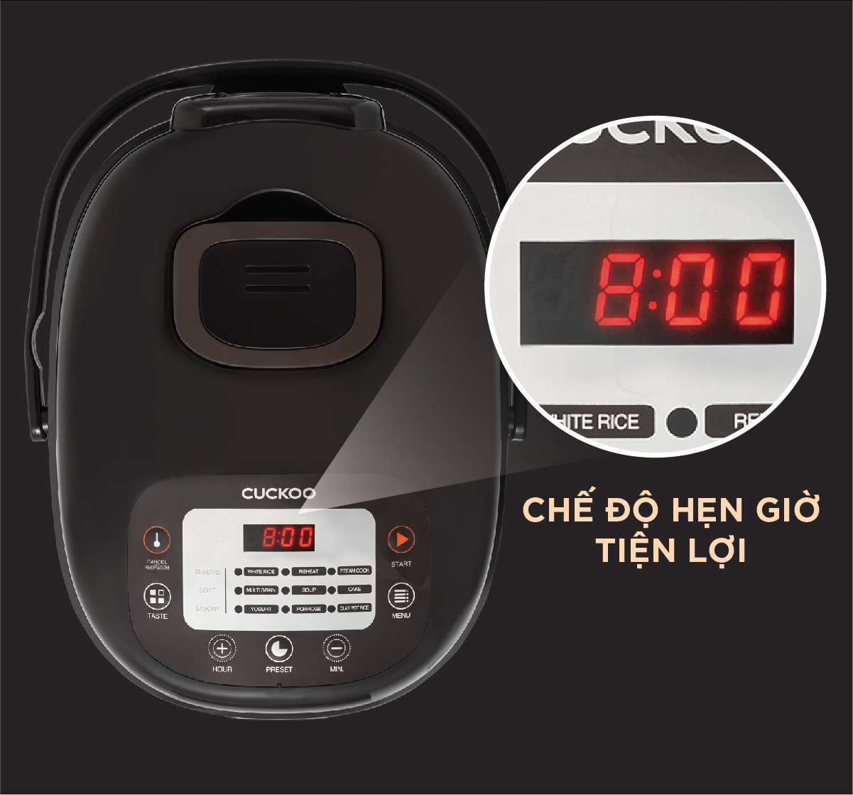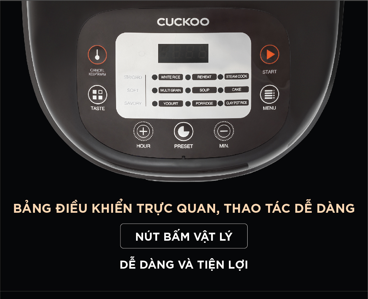 Cuckoo CR-1030F/SIBRCRVNCV mang đến sự đa dạng phong cách chế biến khi được trang bị tới 9 chế độ nấu tương ứng với nhiều loại thực phẩm khác nhau. Tất cả đều được thực hiện dễ dàng với vài thao tác đơn giản.