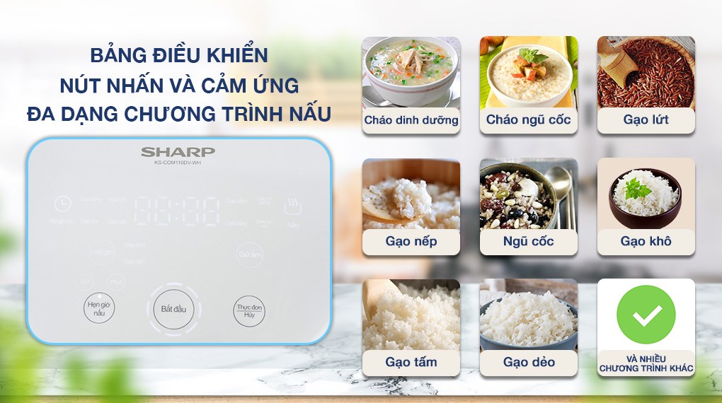 Nồi Cơm Điện Sharp KS-COM110DV-WH tích hợp bảng điều khiển cảm ứng kết hợp nút nhấn, hiển thị rõ nét và dễ sử dụng. Người dùng có thể tùy chọn các chế độ nấu có sẵn như: cháo trắng, cháo ngũ cốc, cháo dinh dưỡng, ngũ cốc, giữ ấm, gạo lứt, gạo nếp, gạo dẻo, gạo khô, gạo trắng, gạo tấm,... giúp linh hoạt trong thực đơn mỗi ngày.