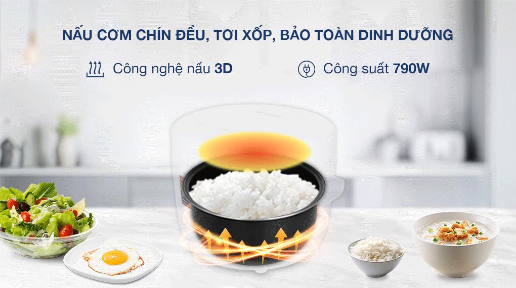 Nồi Cơm Điện Tử Sharp KS-COM110DV-WH hoạt động với công suất 790W kết hợp cùng công nghệ nấu 3D giúp nhiệt lượng lan tỏa đều khắp nồi. Nhờ đó, cơm được nấu chín đều từ trong ra ngoài, hạt gạo giữ được độ dẻo, tơi và vẫn đảm bảo giá trị dinh dưỡng.