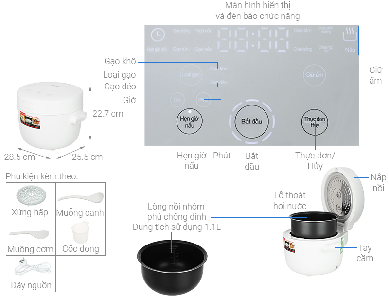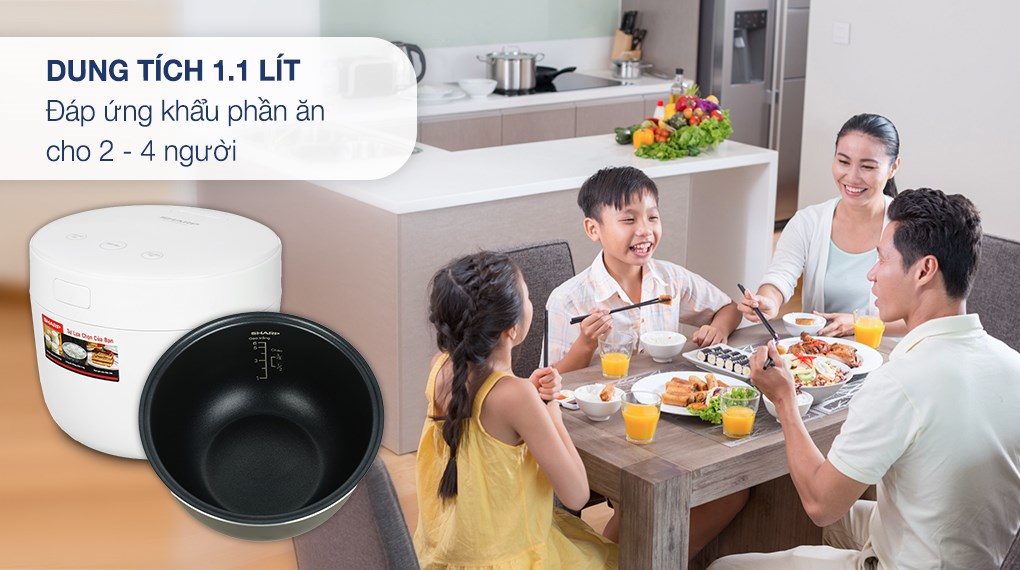 Sản phẩm có dung tích 1.1 lít, nấu được khoảng 6 cốc gạo, đáp ứng tốt nhu cầu của gia đình có từ 2 đến 4 thành viên. Thiết kế nhỏ gọn nhưng vẫn đầy đủ tiện nghi, thích hợp cho các gia đình trẻ, sinh viên hoặc người sống một mình muốn ăn ngon và đủ chất.