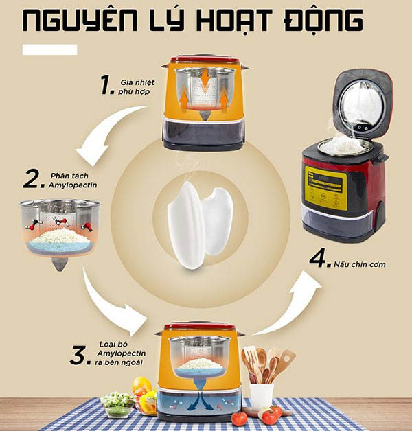 Hệ thống thoát nước thông minh của nồi tự động loại bỏ nước và tất cả Amylopectin ngăn không cho hấp thụ ngược trở lại vào cơm.