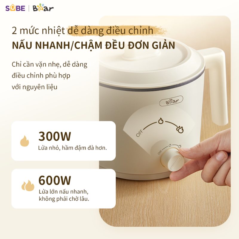 Sản phẩm sở hữu 2 mức công suất 300W và 600W, có thể điều chỉnh dễ dàng bằng núm vặn. Với công suất nhỏ 300W, nồi nấu đa năng mini Bear 1.2L thích hợp cho việc hầm hoặc nấu cháo lâu mà không lo cháy khét. Trong khi đó, công suất lớn 600W phù hợp để nấu lẩu, mì hay các món chiên xào nhanh chóng.