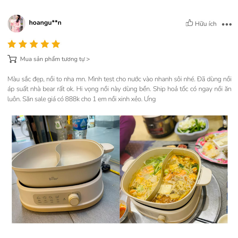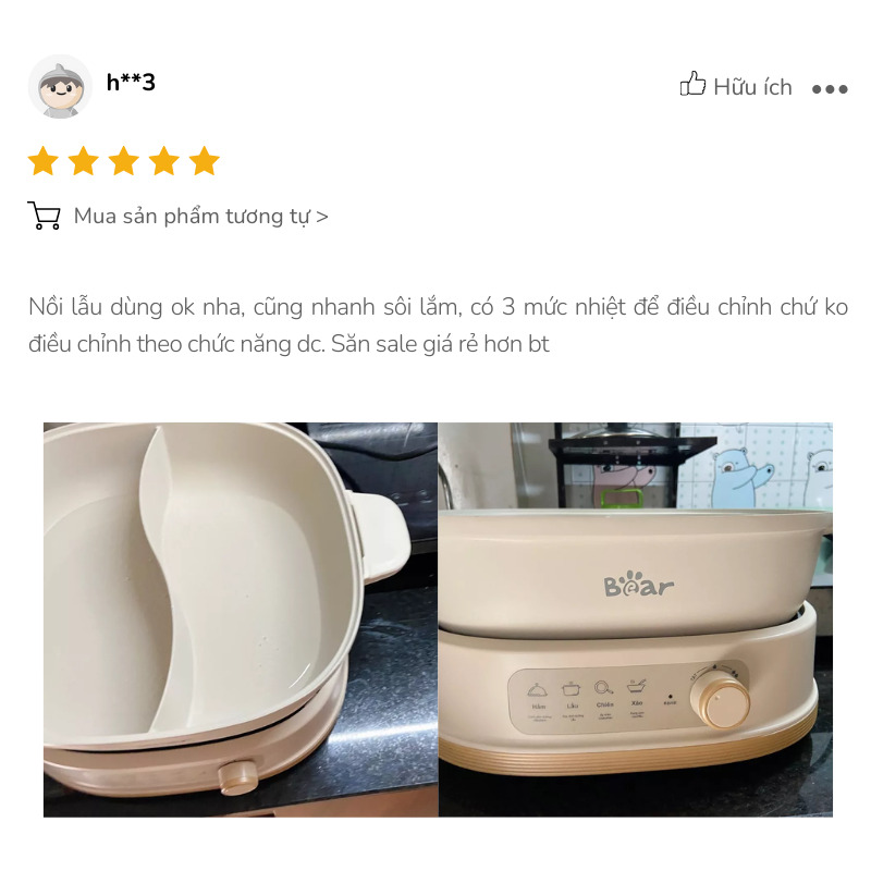 Nồi lẩu điện Bear không chỉ dùng để nấu lẩu mà còn đảm nhiệm tốt nhiều chức năng khác như hầm, chiên, xào... nhờ 2 mức nhiệt linh hoạt (nhỏ – lớn), phù hợp với nhiều món: