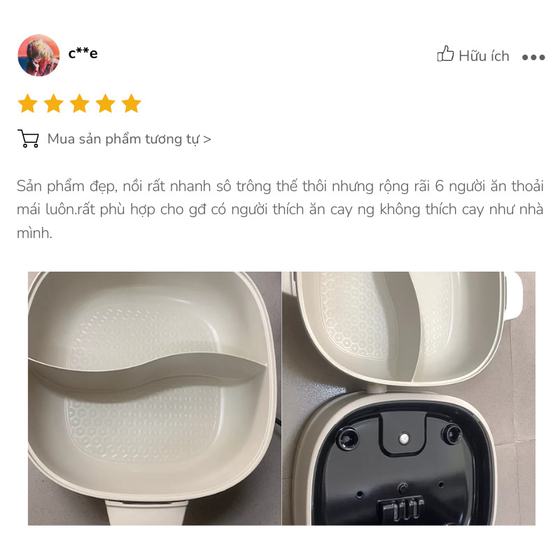 Hai ngăn riêng biệt trong nồi giúp bạn nấu hai loại nước lẩu cùng lúc, ví dụ như lẩu cay cho người lớn và lẩu thanh nhẹ cho trẻ em, đáp ứng khẩu vị đa dạng mà không làm lẫn hương vị. Nắp kính cường lực trong suốt dễ quan sát quá trình nấu ăn mà không cần mở nắp, giữ nhiệt hiệu quả.
