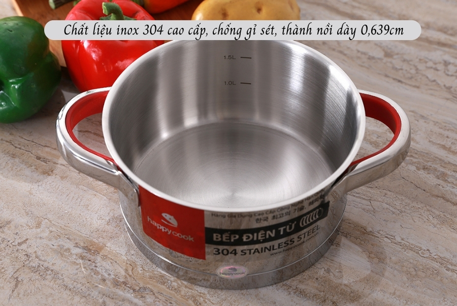 Chất liệu inox 304 cao cấp giúp nồi không chỉ chống gỉ sét mà còn an toàn cho sức khỏe người dùng. Độ dày nồi 0.639 cm đảm bảo độ bền và sự ổn định trong quá trình sử dụng. Nồi chảo Happy Cook cũng dễ vệ sinh sau mỗi lần nấu ăn, giữ cho bề mặt luôn sáng bóng như mới.