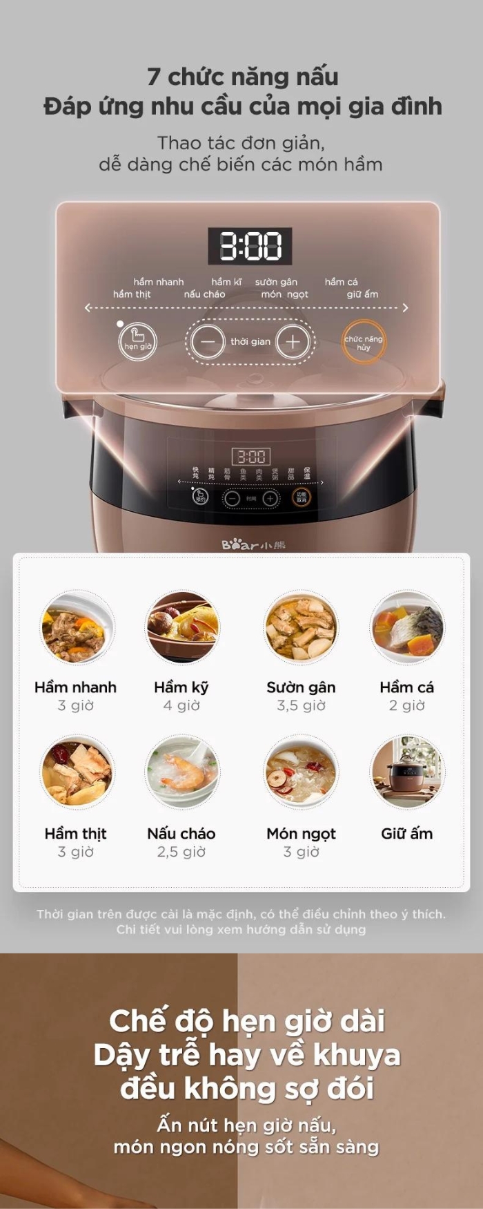 - 7 chức năng tiện lợi: hầm nhanh, hầm kỹ, hầm cá, hầm xương, nấu cháo, món ngọt, giữ ấm