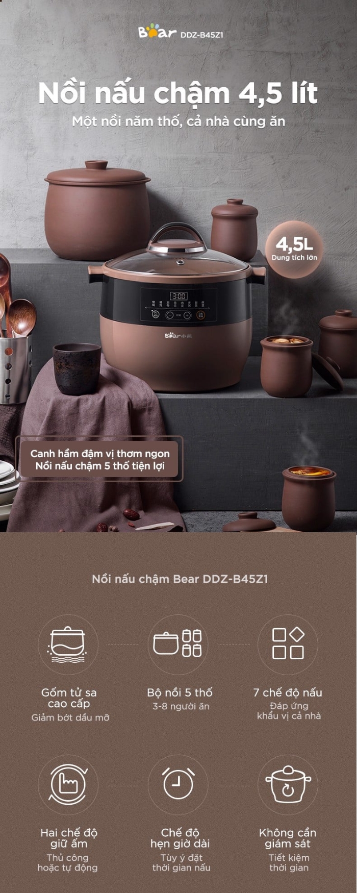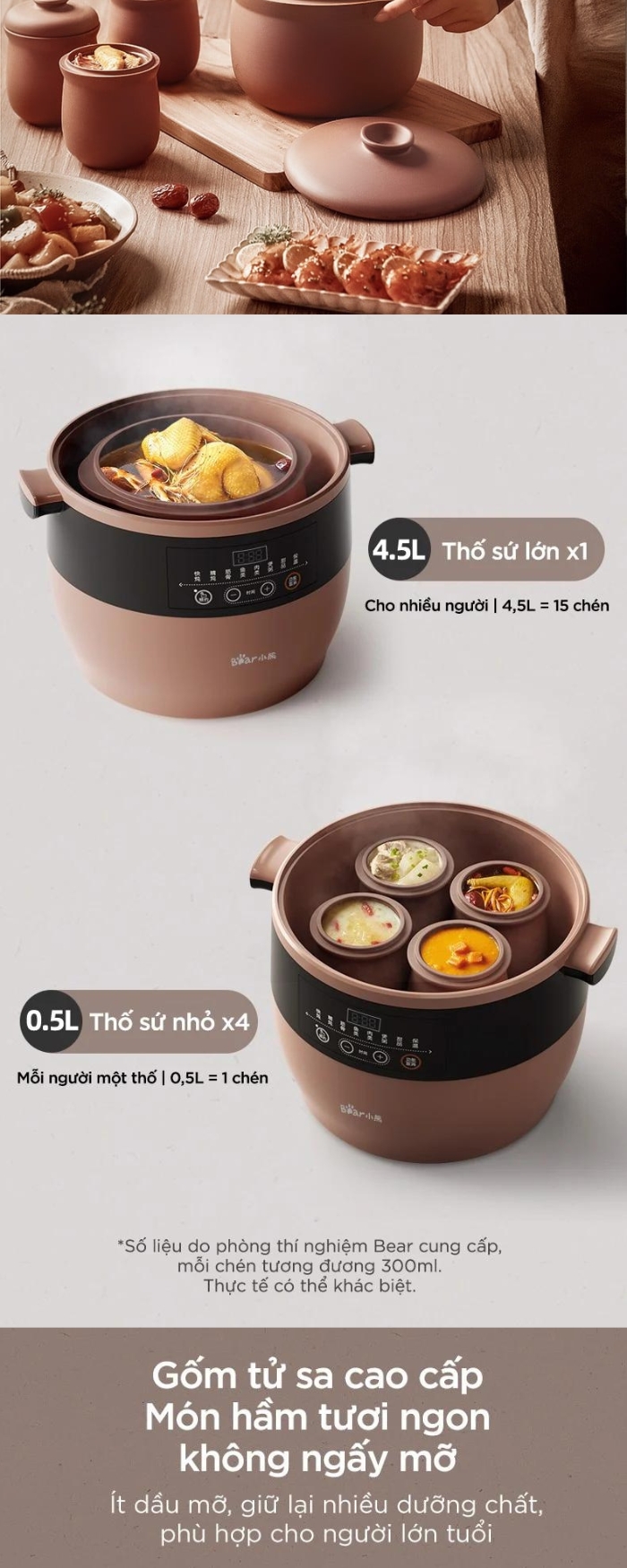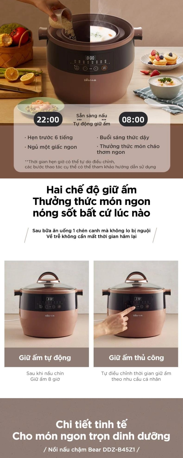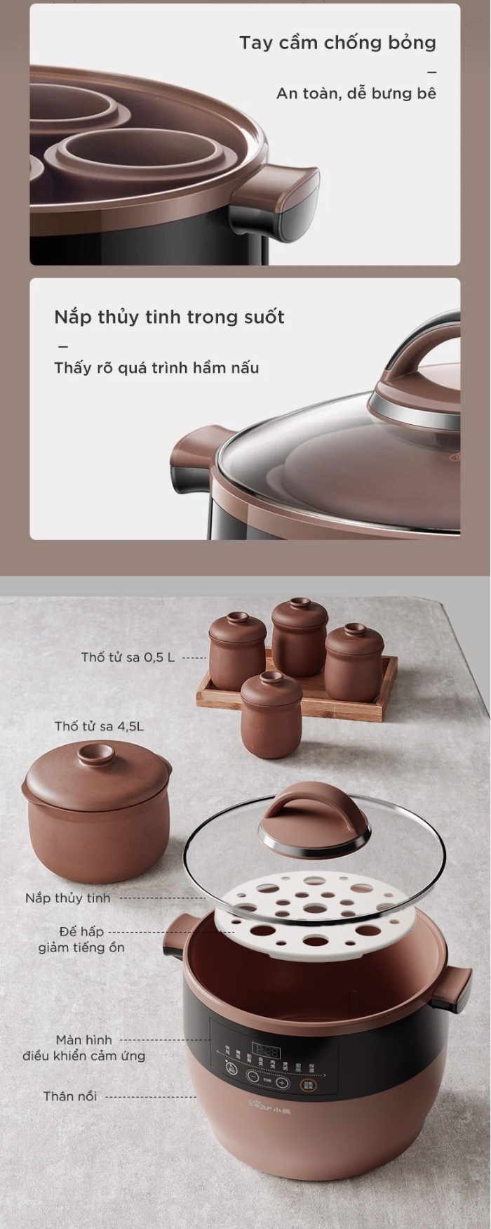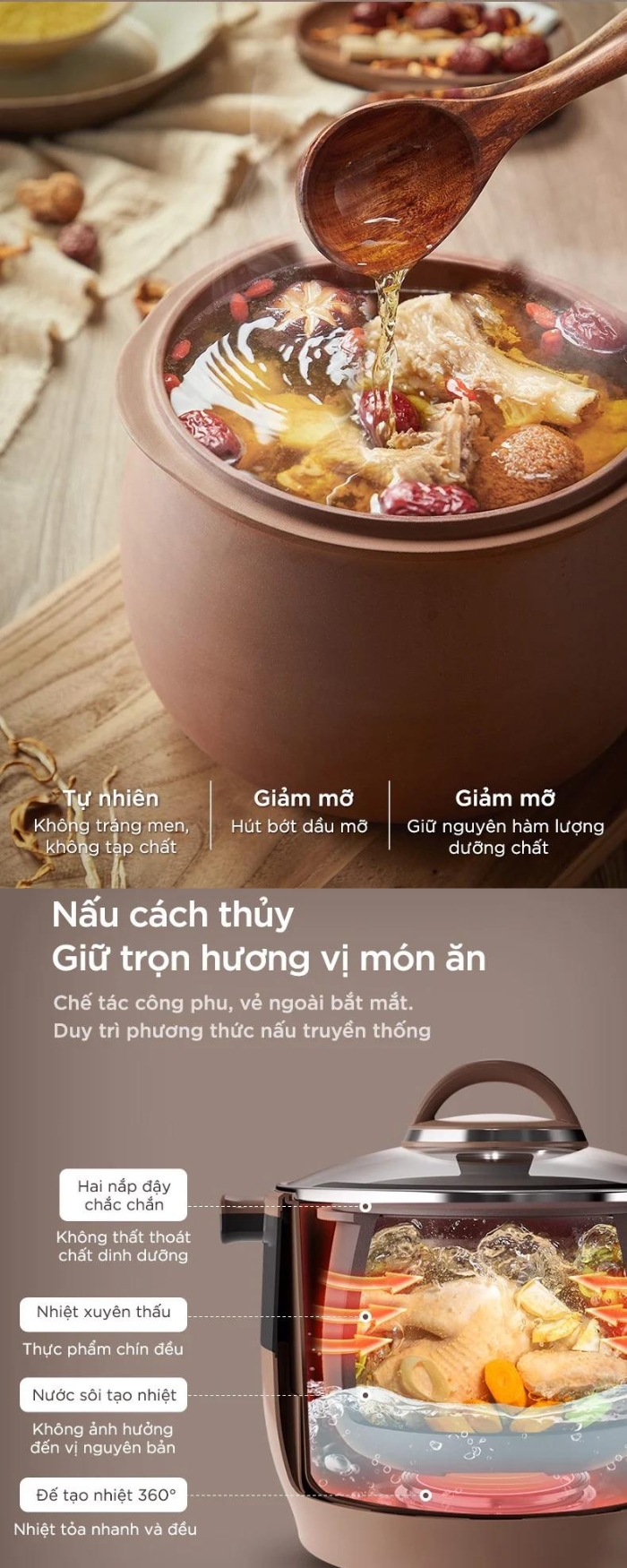 - 2 chế độ giữ ấm và hẹn giờ - Thố được làm 100% từ gốm tử sa cao cấp