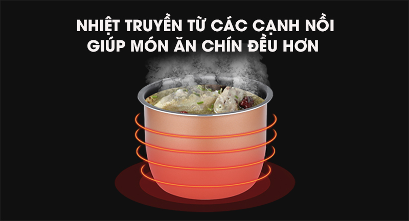 Mâm nhiệt được thiết kế xung quanh lòng nồi giúp lan tỏa nhiệt đều, làm thức ăn chín dần và giảm thiểu hao hụt chất dinh dưỡng.