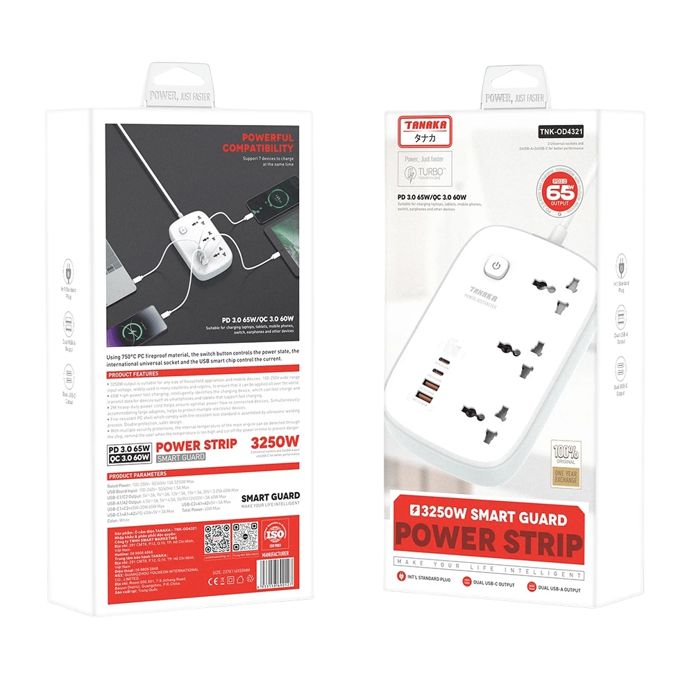 Ổ cắm điện Tanaka TNK-OD4321 là dòng ổ cắm điện thế hệ mới với công suất mạnh mẽ lên đến 3250W. Sản phẩm tích hợp 4 cổng sạc USB hỗ trợ sạc nhanh và chế độ chia tải thông minh, cho phép sạc cùng lúc nhiều thiết bị mà vẫn đảm bảo tốc độ và an toàn. Đây là lựa chọn hoàn hảo cho không gian làm việc, học tập hoặc sử dụng tại gia đình.