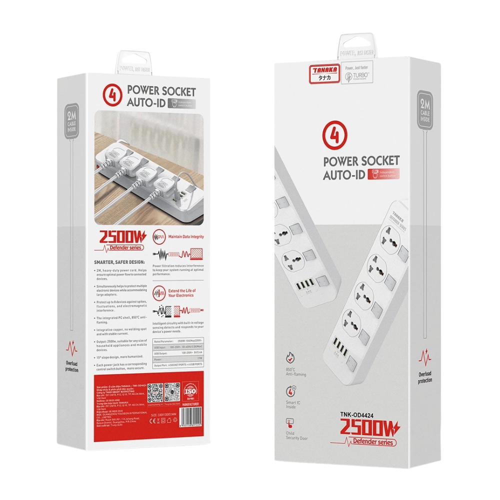 Bên cạnh đó, ổ sạc Tanaka TNK-OD4424 còn có 4 cổng USB sạc nhanh với tổng công suất 17W, đầu ra 5V–3.4A với công nghệ nhận diện thông minh giúp điều chỉnh dòng điện phù hợp cho từng thiết bị, sạc nhanh và ổn định, đồng thời giảm nguy cơ chai pin và tránh phải sử dụng nhiều củ sạc riêng.