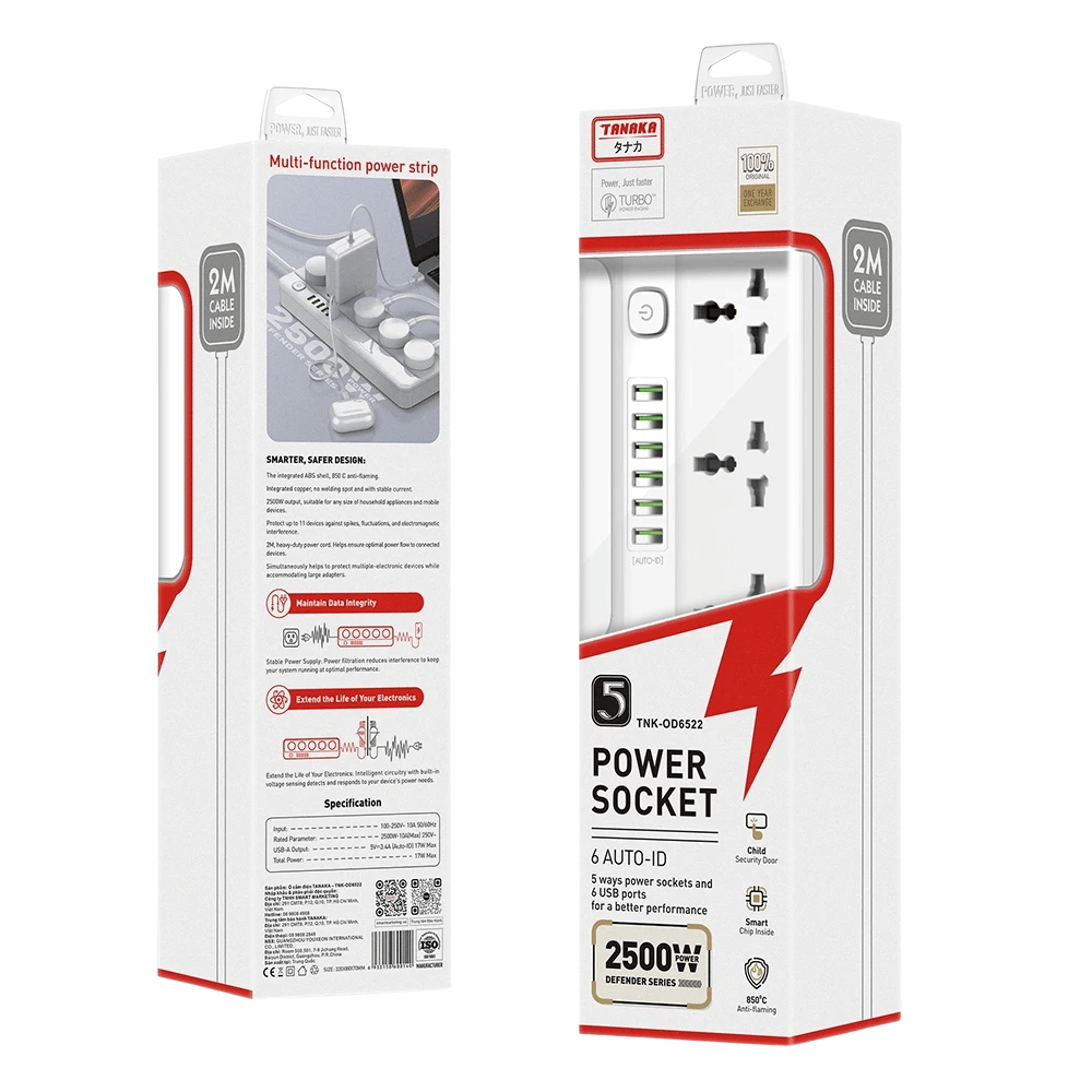 Ổ Cắm Điện Tanaka TNK-OD6522 là lựa chọn lý tưởng cho những ai đang tìm kiếm giải pháp cung cấp điện an toàn, tiện lợi và đa năng trong một thiết kế nhỏ gọn. Sản phẩm tích hợp 5 ổ cắm cùng 6 cổng sạc USB Auto-ID, giúp bạn thoải mái sử dụng nhiều thiết bị điện và sạc các thiết bị cá nhân một cách nhanh chóng, ổn định.