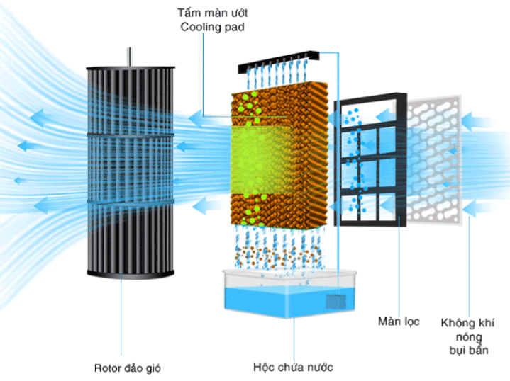 Quạt điều hòa là thiết bị làm mát không khí dựa trên quá trình bốc hơi nước tự nhiên, sử dụng tấm làm mát (Cooling Pad). Khi hoạt động, hệ thống bơm sẽ đưa nước tuần hoàn lên tấm làm mát, tại đó nước bay hơi và hấp thụ nhiệt, làm giảm nhiệt độ không khí thổi ra.