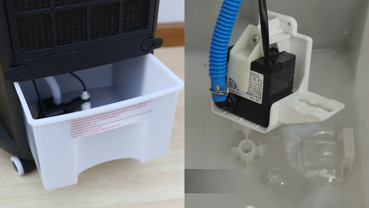 - Bình chứa nước: Nằm ở phía dưới thân máy, là nơi chứa nước cung cấp cho tấm làm mát. Dung tích bình chứa khác nhau tùy theo từng model.