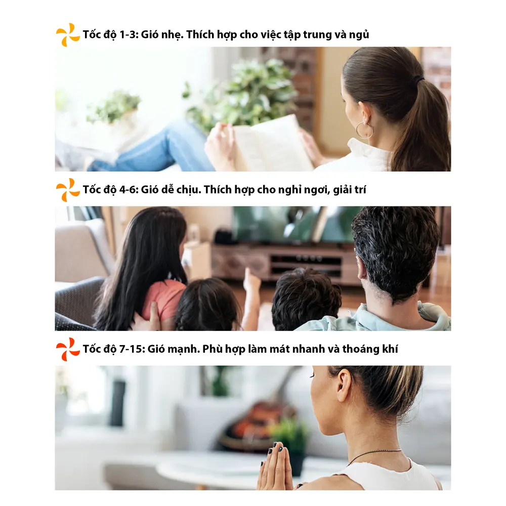 Quạt được trang bị tới 15 cấp độ gió, điều chỉnh linh hoạt từ nhẹ nhàng đến mạnh mẽ. Dù là thư giãn khi ngủ, làm việc hay giải trí, bạn đều có thể tìm được luồng gió phù hợp với nhu cầu của mình.