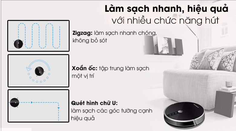 Tự dộng quay về trạm sạc: tự về trạm sạc khi gần hết pin, khi hoàn thành công việc hoắc khi mình muốn.