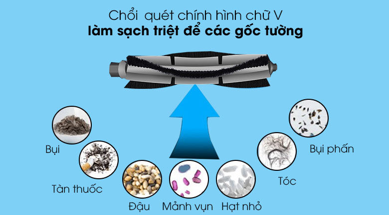 Robot hút bụi Shimono sử dụng hệ thống chổi quét cạnh đôi và bàn chải cuộn chống rối hình chữ V, có thể thay thế bằng cổng hút lớn để làm sạch thảm hiệu quả.