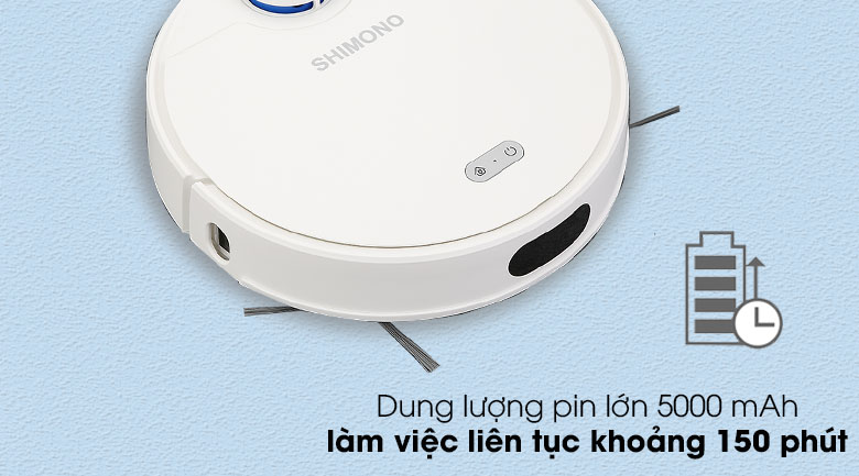 Dung lượng pin khủng 5000 mAh cho phép robot hoạt động liên tục khoảng 150 phút, tương ứng diện tích làm sạch đến 280 m². Khi pin yếu, robot tự động quay về đế sạc và tiếp tục công việc sau khi sạc đầy (trong khoảng 4 - 5 giờ).