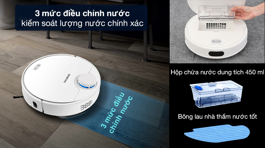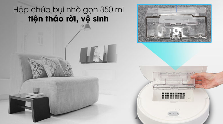 Robot được tích hợp hộp chứa bụi 350 ml và hộp chứa nước 450 ml có thể tháo rời, thay thế linh hoạt tùy theo nhu cầu sử dụng. Đặc biệt, tính năng phun nước điện tử 3 mức độ giúp làm sạch sàn nhà hiệu quả và khô nhanh, phù hợp với nhiều loại bề mặt như gạch men, gỗ, thảm,...