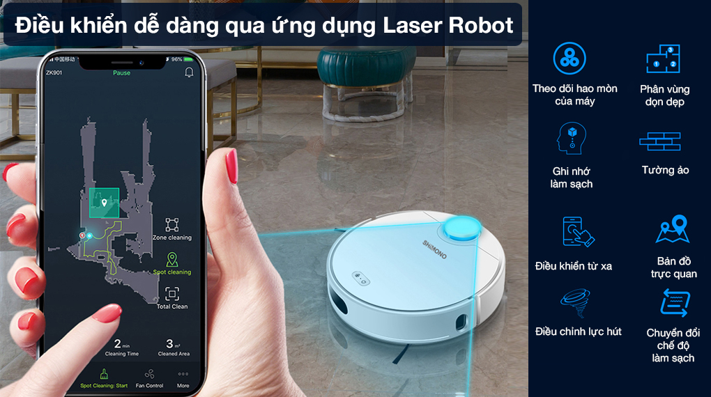 Người dùng có thể dễ dàng điều khiển robot từ xa thông qua ứng dụng Laser Robot, bao gồm việc lên lịch hoạt động theo tuần, phân chia khu vực dọn dẹp, điều chỉnh chế độ hút/lau cũng như theo dõi hao mòn thiết bị. Robot hoạt động linh hoạt với nhiều chế độ như zigzag, tự động, quét cạnh và xoắn ốc – phù hợp với mọi nhu cầu vệ sinh.