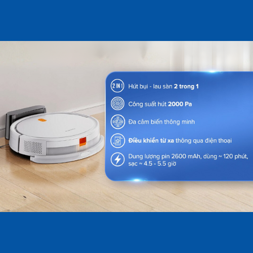 Robot hút bụi lau nhà Xiaomi Vacuum E5 Trắng EU là lựa chọn phù hợp cho người tìm một robot làm sạch hiệu quả, độ bền cao và giá phải chăng. Với lực hút mạnh, hệ thống lau cải tiến, dẫn đường thông minh và khả năng điều khiển qua app, E5 mang đến trải nghiệm dọn dẹp nhẹ nhàng, tiện lợi, tiết kiệm thời gian.
