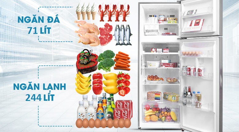 - Dung tích tổng: 333L, dung tích ngăn đá: 71L + dung tích ngăn lạnh: 244L