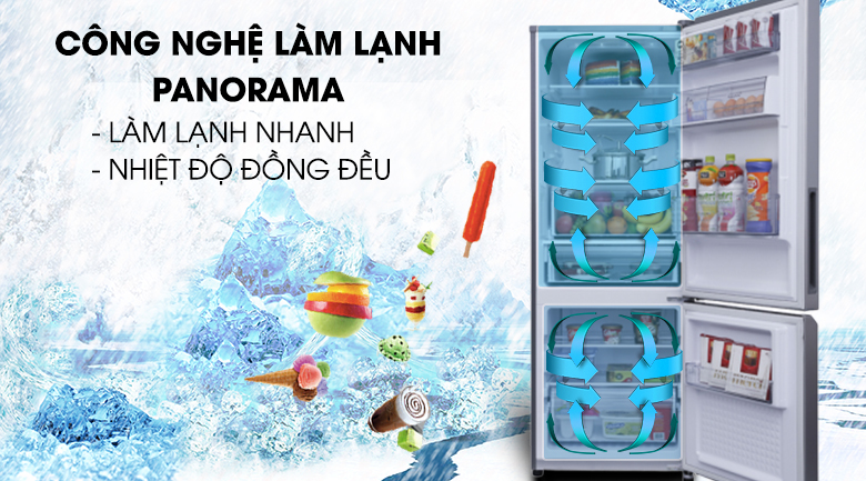 Công nghệ Panorama phân phối hơi lạnh đồng đều đến mọi ngóc ngách trong tủ lạnh, đảm bảo chất lượng thực phẩm luôn được duy trì tốt nhất.