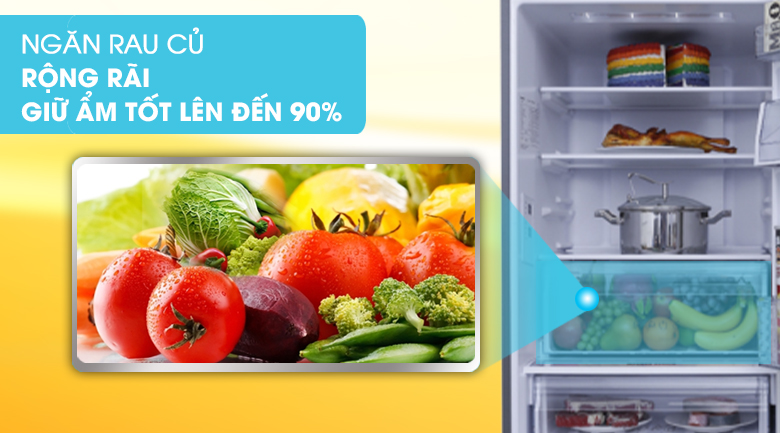 Ngăn rau củ rộng rãi giúp duy trì độ ẩm cho rau củ, giữ cho chúng luôn tươi mới. Khay kính chịu lực được thiết kế bền bỉ và dễ lau chùi, giúp bạn quản lý thực phẩm một cách hiệu quả.