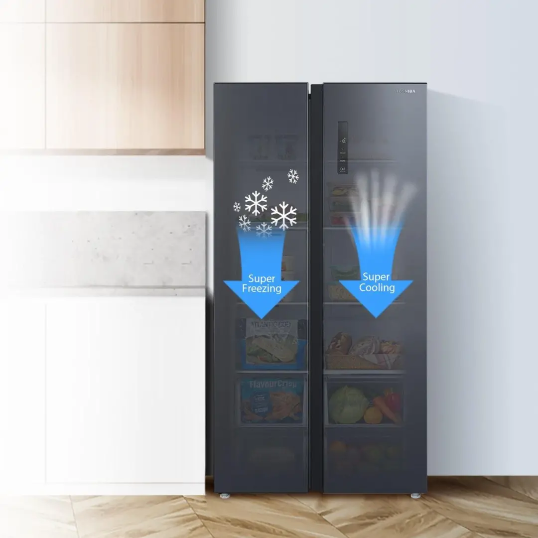 Tủ lạnh Toshiba Inverter Side By Side GR-RS696WI-PMV(60)-AG được trang bị chế độ Super cooling (làm lạnh siêu nhanh) và Super freezing (cấp đông siêu tốc). Hai chế độ này giúp thực phẩm được làm lạnh và cấp đông nhanh chóng, giảm thiểu sự hình thành tinh thể băng, ngăn chặn tình trạng mất nước và biến đổi cấu trúc, từ đó giữ trọn vẹn dinh dưỡng và hương vị tươi ngon của thực phẩm.