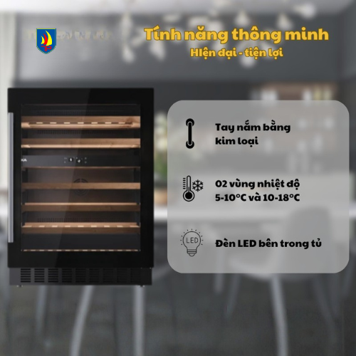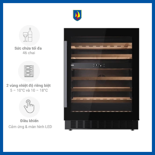 Đặc trưng của mẫu này là phù hợp với 46 chai chuẩn 750 ml, giúp người dùng an tâm trưng bày và bảo quản bộ sưu tập rượu quý ngay tại gia, trong khi vẫn đảm bảo nhiệt độ và độ ẩm lý tưởng cho từng loại rượu.