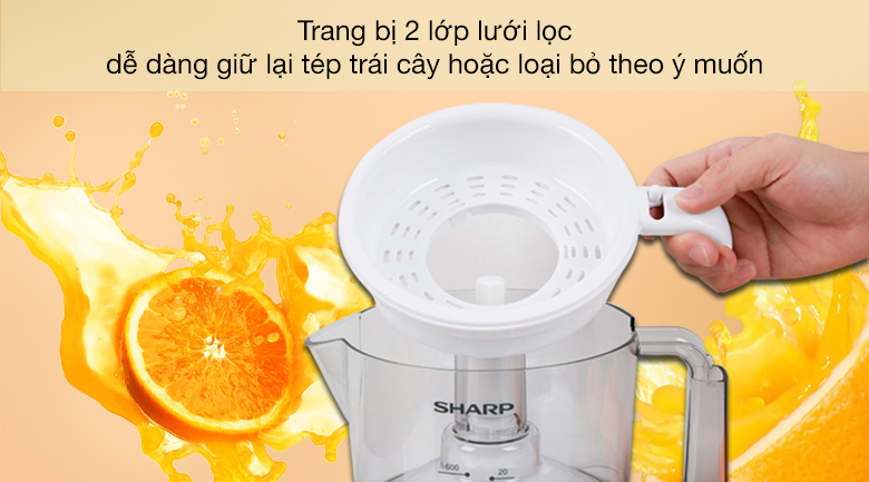 Trang bị hai lớp lưới lọc có thể điều chỉnh độ mịn theo sở thích, máy vắt cam Sharp EJ-J256-WH giúp bạn dễ dàng chọn lựa mức độ lọc phù hợp. Bạn có thể giữ lại tép cam để nước ép thêm dinh dưỡng hoặc lọc kỹ để có ly nước trong, mịn hơn.
