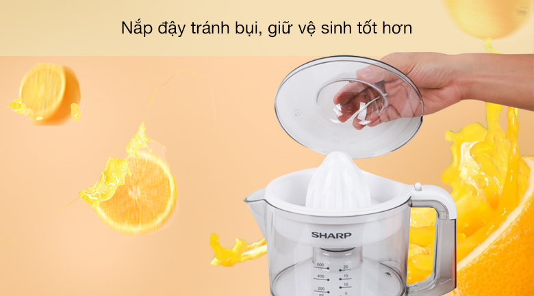 Máy vắt cam Sharp EJ-J256-WH có nắp đậy trong suốt giúp bảo vệ máy khỏi bụi bẩn, côn trùng khi không sử dụng. Nhờ đó, sản phẩm luôn sạch sẽ, đảm bảo an toàn thực phẩm.
