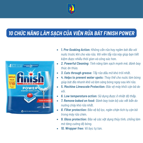 Finish là thương hiệu hóa phẩm rửa chén số 1 tại nhiều thị trường lớn. Phiên bản Power All in 1 được thiết kế để phù hợp hầu hết các dòng Máy rửa chén - Máy sấy chén đang được bán tại Việt Nam.