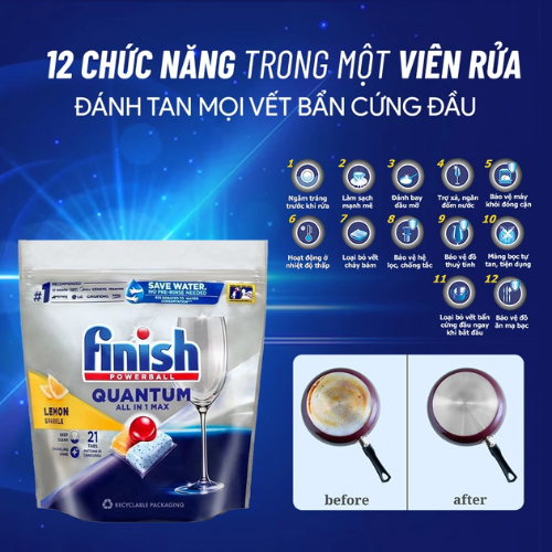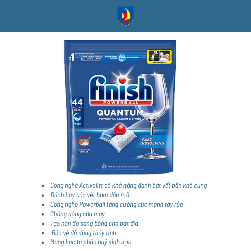 Trong thế giới hóa phẩm rửa chén, Finish là thương hiệu được tin dùng hàng đầu, đặc biệt trong những gia đình sử dụng máy rửa chén thường xuyên. Viên rửa chén Finish Quantum All in 1 44 nổi bật nhờ cơ chế làm sạch đa tầng, giúp xử lý dầu mỡ và cặn bám nhanh hơn 50% so với viên nén truyền thống.
